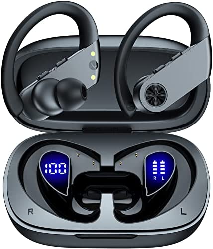 Bluetooth Headphones Wireless Earbuds 90H Playtime with 2200mAh Charging Case Dual Power Display Ear Buds Waterproof Over Ear Earphones with Earhooks for Sport Workout Laptop TV Computer Phone Black
